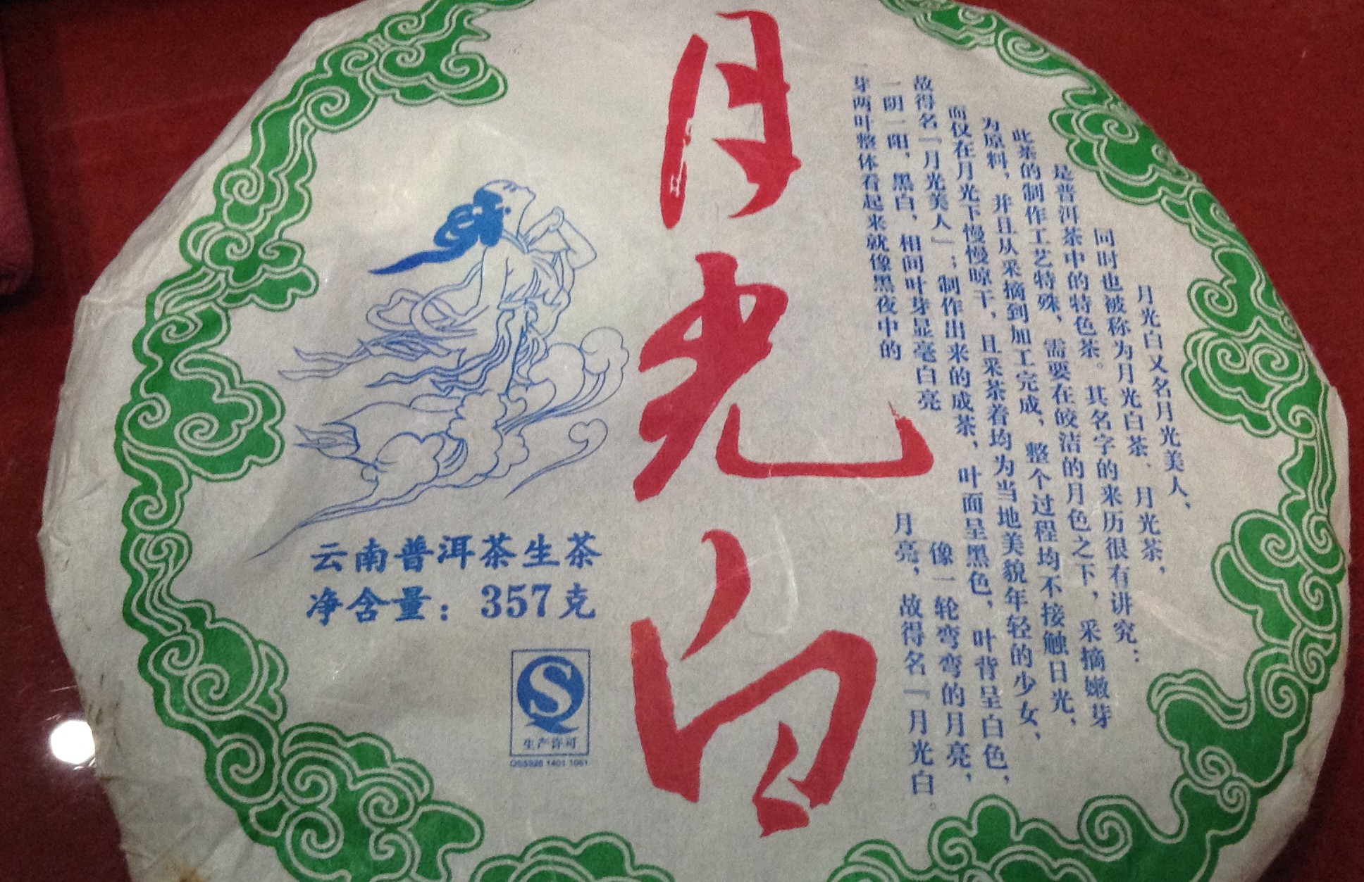 The following text was originally in Chinese, printed on the paper wrapping of the Moonlight White Pu’er tea cake, shown in the photograph.